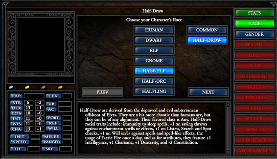 The Temple of Elemental Evil (Temple+) - Mód na rasu Půl-Drow ![]() ![]() ![]() ![]() Popis: Jedná se o podrasu pro rasu Půl-Elf. Udělal jsem to hlavně kvůli možnosti hraní na role. Zároveň se to dá použít jako minimalistický příklad přidávání vlastní podrasy do hry. Pro verzi hry: Otestováno na 1.0.95 (jiné verze potřebují úpravy) |